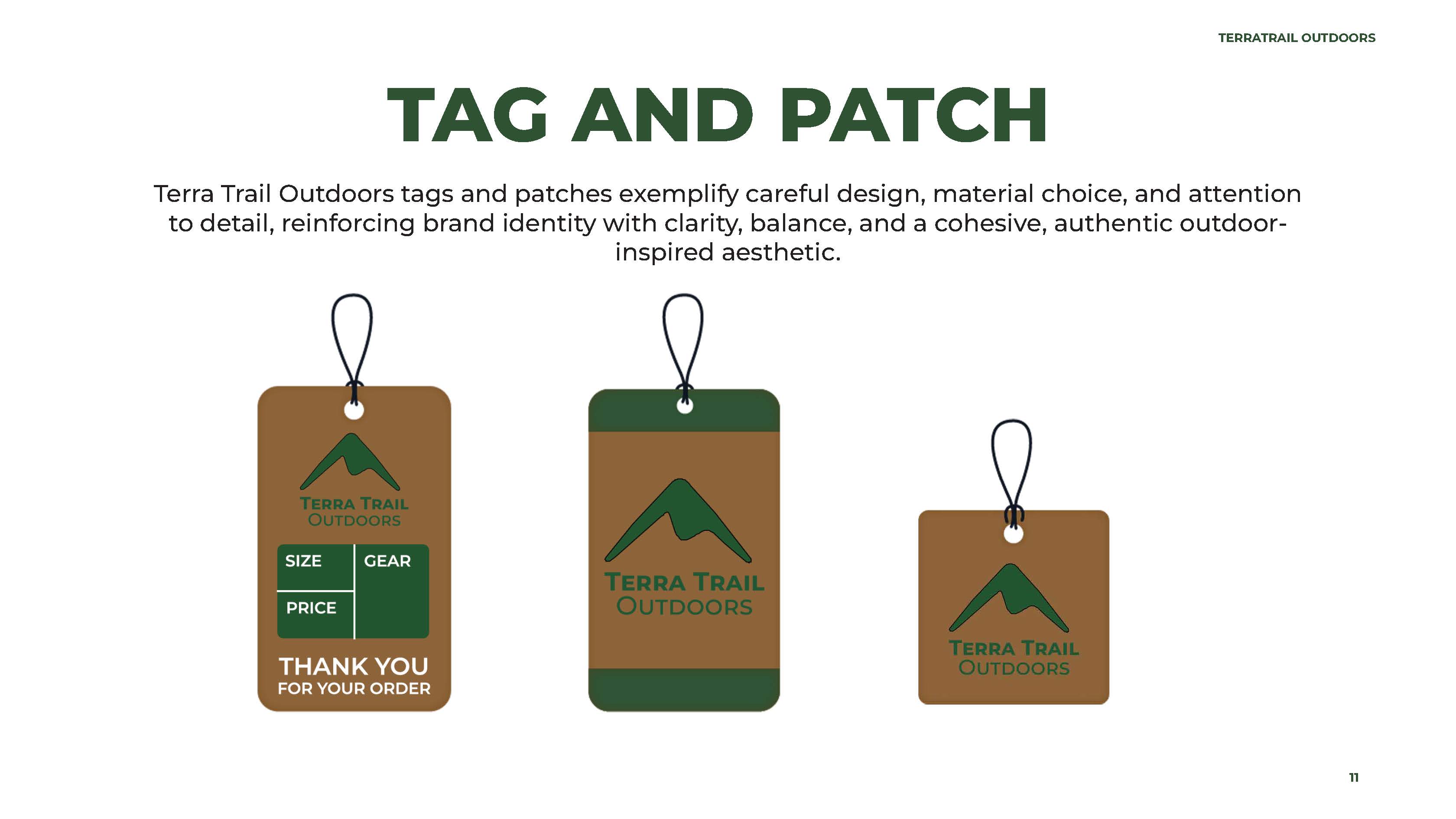 The final outcome is a comprehensive brandbook that clearly defines the visual identity of Terra Trail Outdoors, along with a range of marketing materials that demonstrate how the brand can be applied across different mediums. The visuals include color systems, iconography, logo usage guidelines, and product applications such as tags and gear.