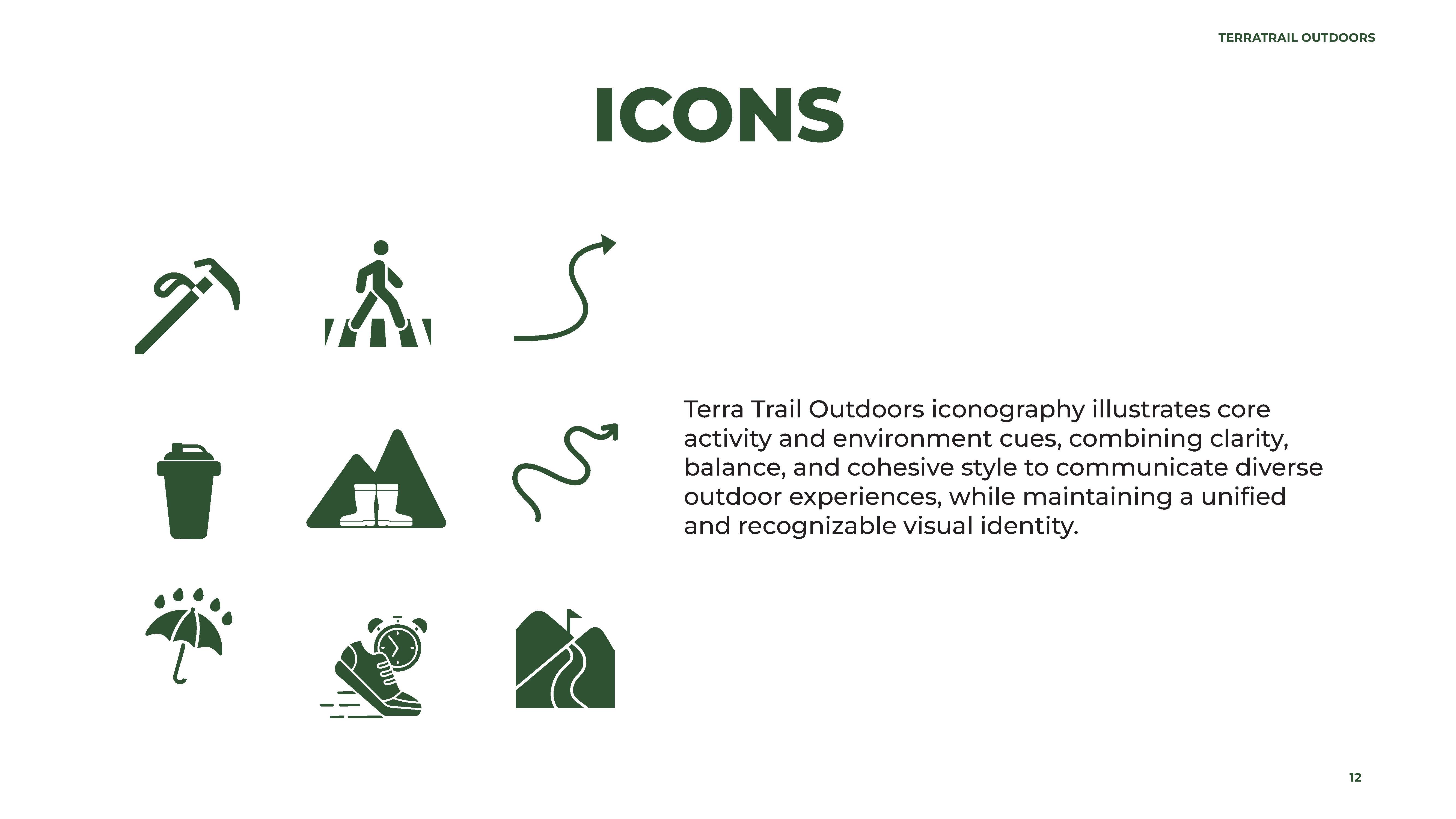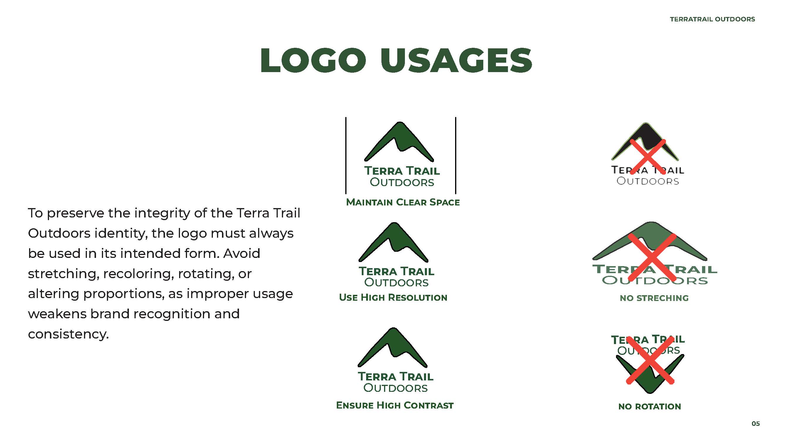 The Brandbook and Marketing Materials project was developed to define and communicate a clear visual identity for Terra Trail Outdoors. It includes key brand elements such as color schemes, iconography, logo usage guidelines, and supporting visuals that reflect an outdoor and adventure-driven aesthetic.